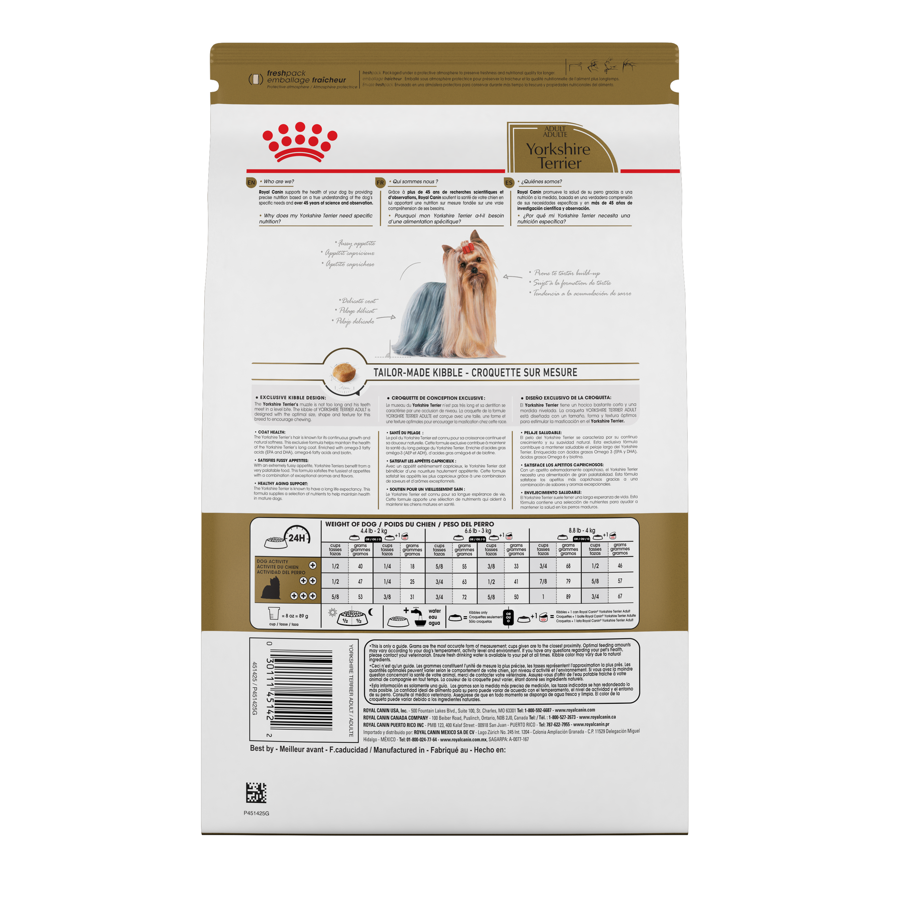 Les croquettes Royal Canin Yorkshire Terrier pour chiens adultes offrent à votre Yorkshire Terrier adulte une alimentation complète, équilibrée et adaptée à ses besoins. Son pelage unique, composé de poils continus, nécessite un apport en biotine et en acides gras oméga-3 et oméga-6 pour un pelage doux et soyeux. Enrichies en nutriments ciblés comme la vitamine C, l'EPA et le DHA, ces croquettes contribuent à préserver la vitalité de votre chien de petite race face aux premiers signes de l'âge. De plus, leur petite taille et leur forme favorisent la mastication et limitent la formation de tartre.