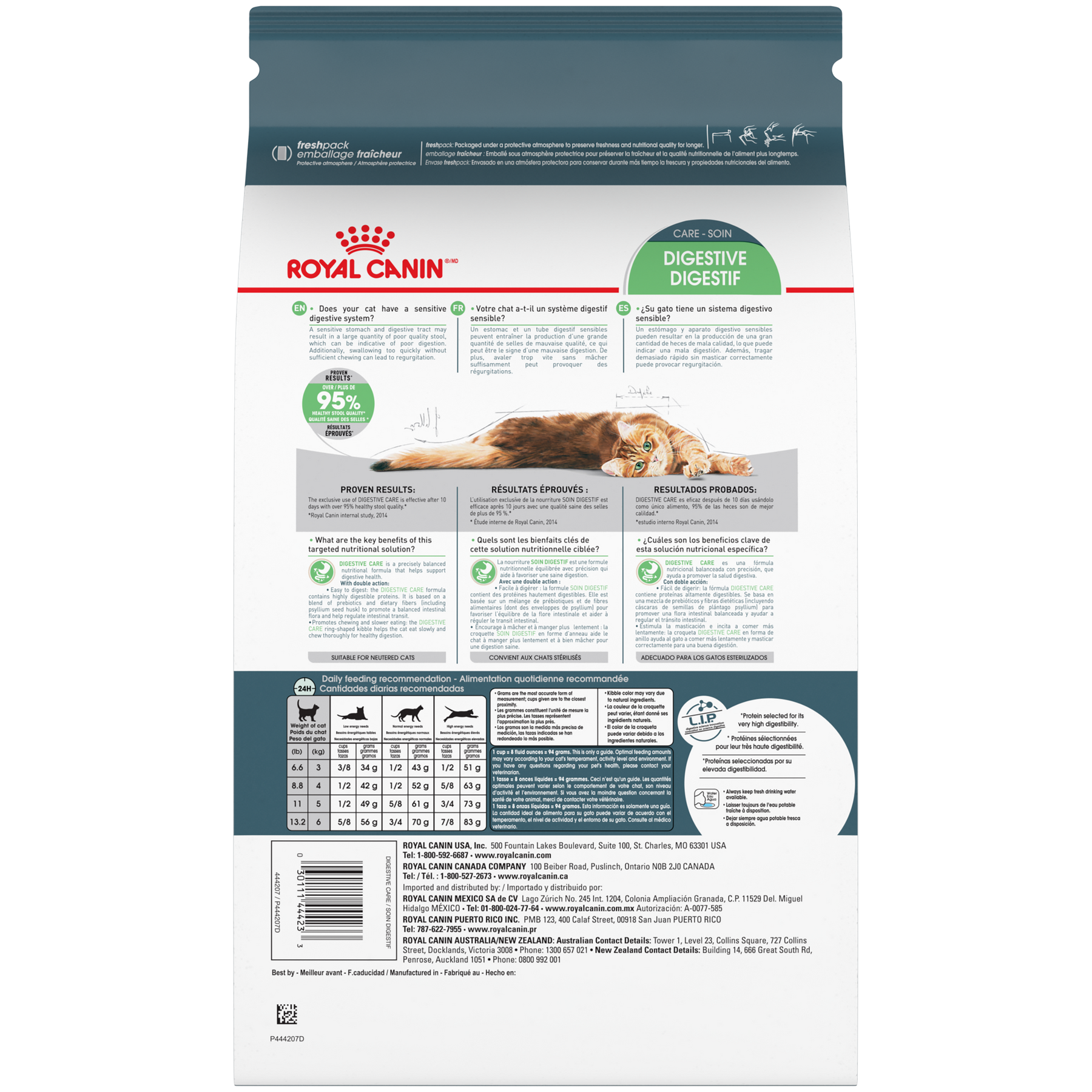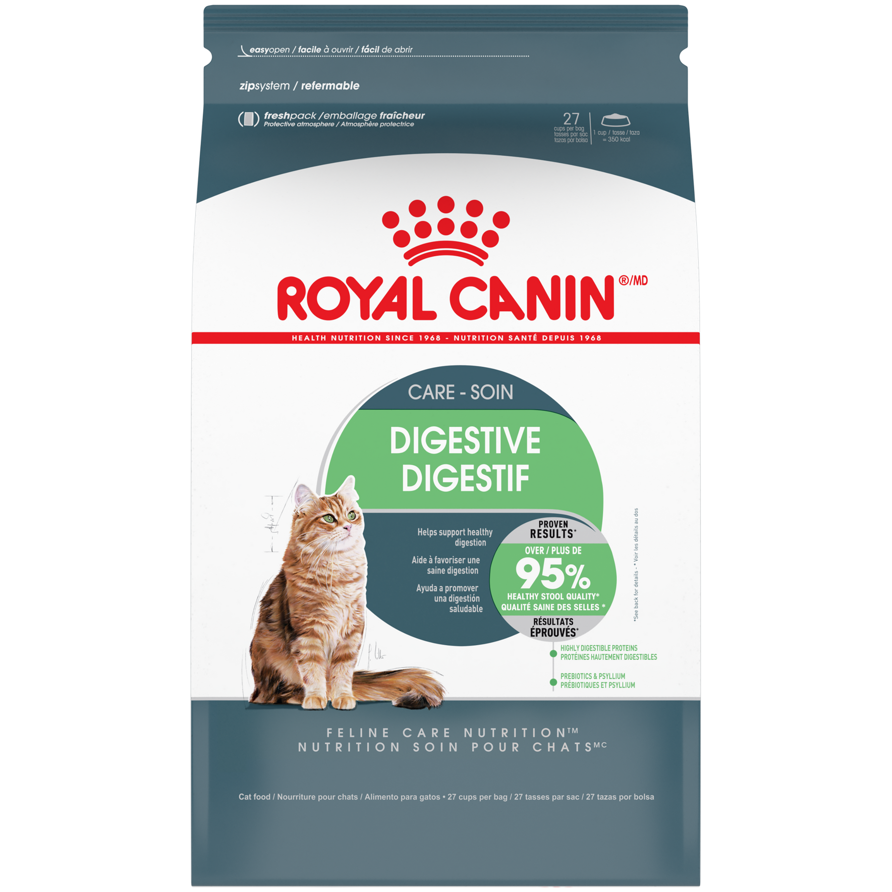 Formulée pour les chats adultes ayant une digestion sensible, Royal Canin Soin Digestif aide à soutenir la santé digestive et à améliorer la qualité des selles. Un système digestif sensible peut entraîner des selles volumineuses ou de mauvaise qualité. Cette recette contient des protéines hautement digestibles ainsi qu’un mélange spécifique de prébiotiques et de fibres, incluant du psyllium, pour favoriser l’équilibre de la flore intestinale et un transit intestinal sain. Sa croquette de forme unique est conçue pour encourager une mastication plus lente, contribuant ainsi à une meilleure digestion.
